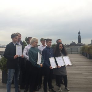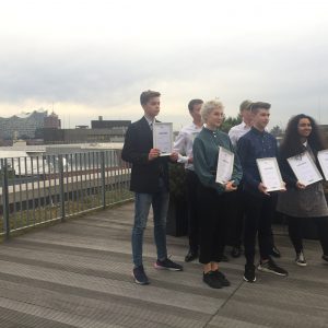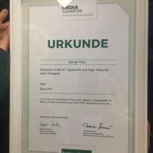 Stephan Steinlein (Chefredaktion Hamburger Abendblatt) und Thomas Bressau ( Behörde für Schule und Berufsbildung) ehren in einer Feierstunde am 1. November 2018 sechs ausgezeichnete Nachwuchsjournalisten und Teilnehmende beim Wettbewerb „Schüler machen Zeitung 2018“. Die Preisträgerin in der Kategorie Gesellschaft heißt Saari Pirr (plus-Klasse F 16-P1) und ist im dritten Ausbildungsjahr zur Friseurin bei Martin Max. Mit Ihrem Artikel: „Sexismus im Beruf: Lippenstift und High Heels für mehr Trinkgeld“ überzeugte Saari Pirr die mit Dirk Westphal (Vattenfall) und Frank Haberzettel (Commerzbank) hochkarätig besetzte Jury des Hamburger Abendblatts. Über eine solch herausragend gute Leistung hocherfreut zeigen sich Ausbilder Martin Max, die Schulleitung der Beruflichen Schule Burgstraße mit Schulleiterin Astrid Arndt und Abteilungsleiter Thomas Lücking sowie das plus-Lehrerteam.