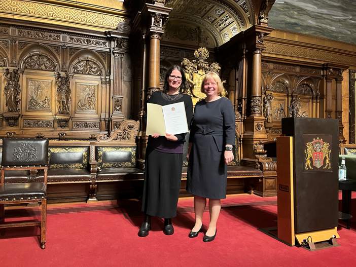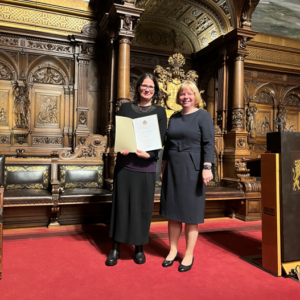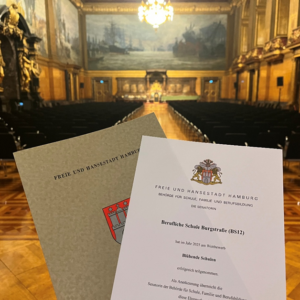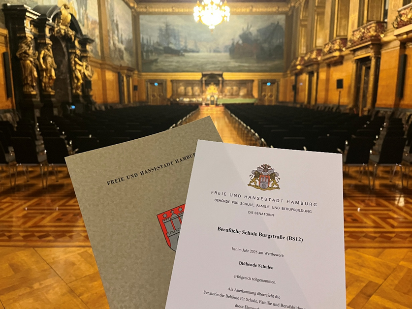 In der Ehrung der Hamburger PreisträgerInnen in Schülerwettbewerben in 2025 wurden wir aufgrund unseres Preises beim Wettbewerb der blühenden Schulen der Loki Schmidt Stiftung prämiert. In einer feierlichen Zeremonie mit der Staatsrätin der Behörde für Schule, Familie und Berufsbildung, Katharina von Fintel, im großen Festsaal des Rathauses wurden am 3.12.25 die Urkunden verliehen.