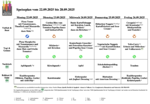 Speiseplan für die Woche vom 22.09. – 26.09.2025, zum Vergrößern hier oder auf das Bild klicken.