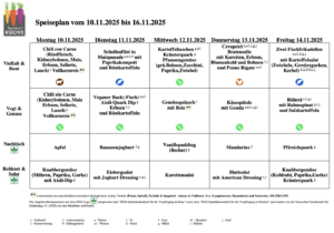 Speiseplan für die Woche vom 10.11. – 14.11.2025, zum Vergrößern hier oder auf das Bild klicken.