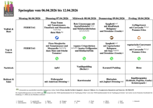 Speiseplan für die Woche vom 06.04. – 10.04.2026, zum Vergrößern hier oder auf das Bild klicken.